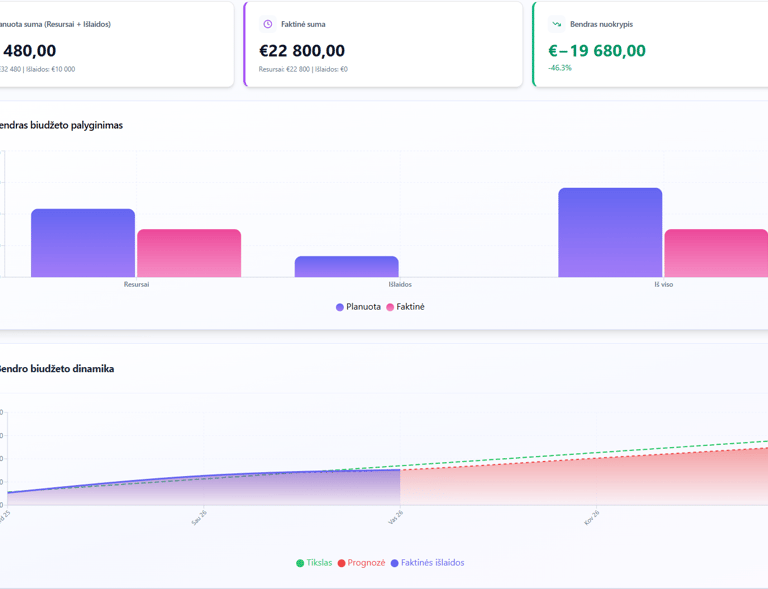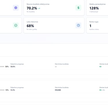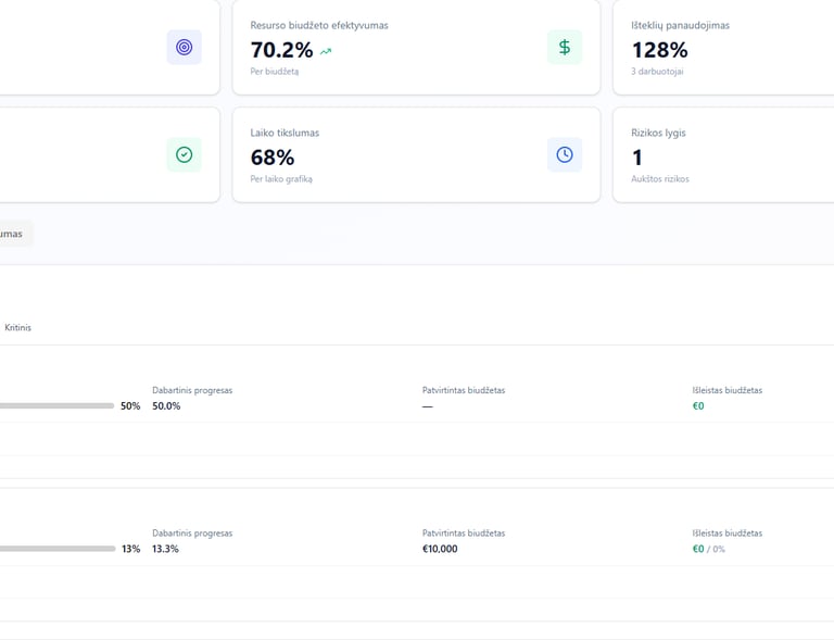 Taip pat ji leidžia analizuoti nenumatytus atvejus, tokius kaip projektų vėlavimai ar sustabdymai, įvertinti jų priežastis ir poveikį. Galėsite matyti projektų kaštus, biudžeto panaudojimą bei resursų apkrovą – tiek bendrai, tiek detaliai.